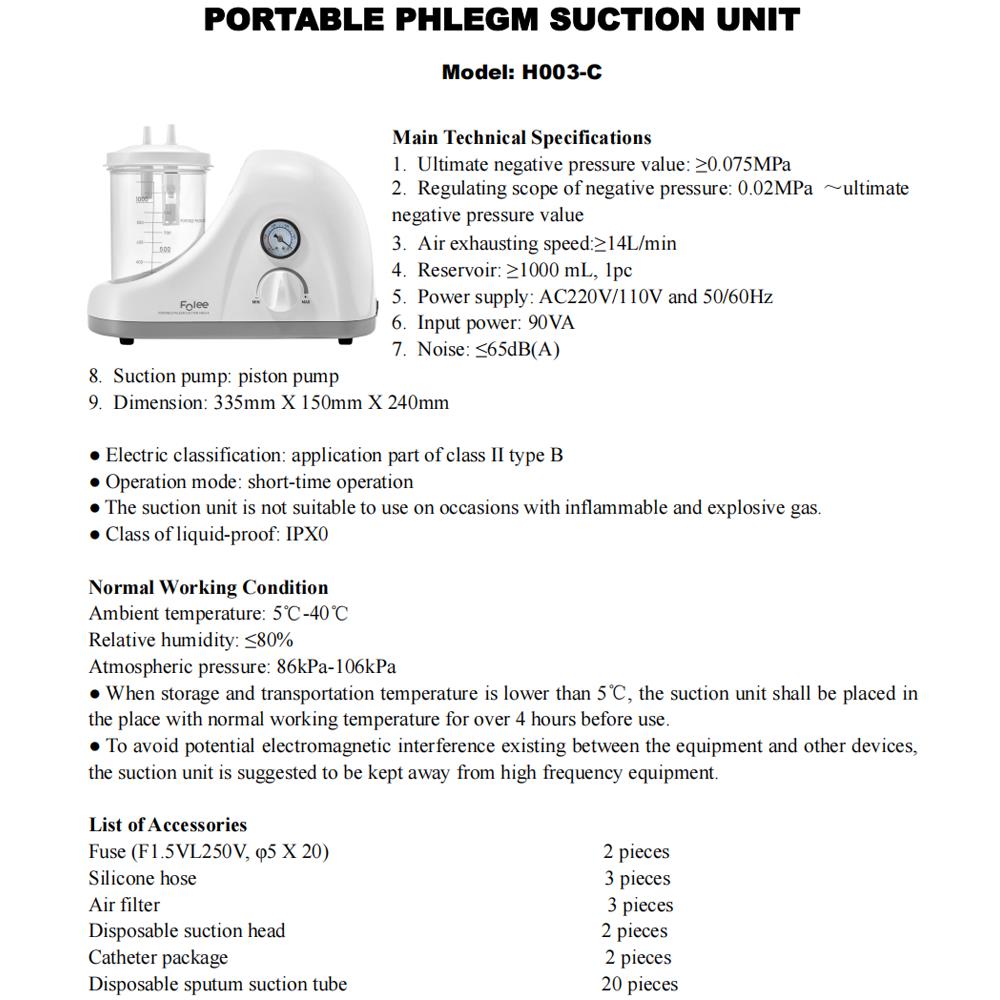 Portable Phlegm Suction Unit is a newly designed oil-free lubrication pump based on extensive design experience and development of domestic and overseas products. It is specially designed for absorbing thick liquid such as blood, phlegm etc. it is not only used as aspirator in operation room, emergency room, but also at home as health care product.